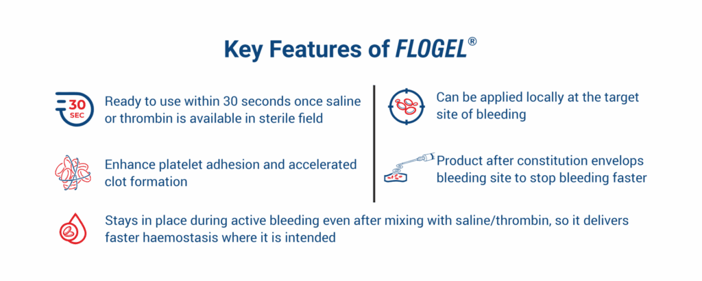 FLOGEL® is a flowable gelatin haemostatic matrix, works through platelet adhesion, accelerating platelet plug formation to aid in fibrin clot formation. It is designed for easy application to a bleeding site that occurs in tight and irregular spaces, especially at a difficult to reach surgical site.