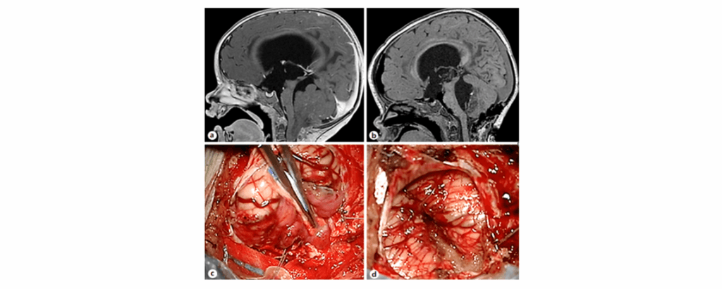 Figure 2. a) Preoperative MRI showing a lesion within the fourth ventricle b) Postoperative T1-weighted MRI confirming gross total resection without haemorrhage; histology: ependymoma (WHO grade II) c) Tumor exposure below the cerebellar haemispheres d) Surgical field filled with thrombin-gelatin haemostatic matrix5